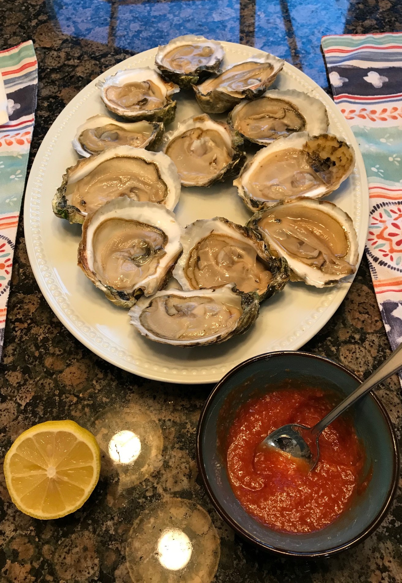 We enjoyed the oysters at Tiffany's house at Christmas so much Mark decided to replicate with east coast oysters this time in Naples. He's getting good at this shucking thing - a newly purchased tool helped. Yummy stuff.